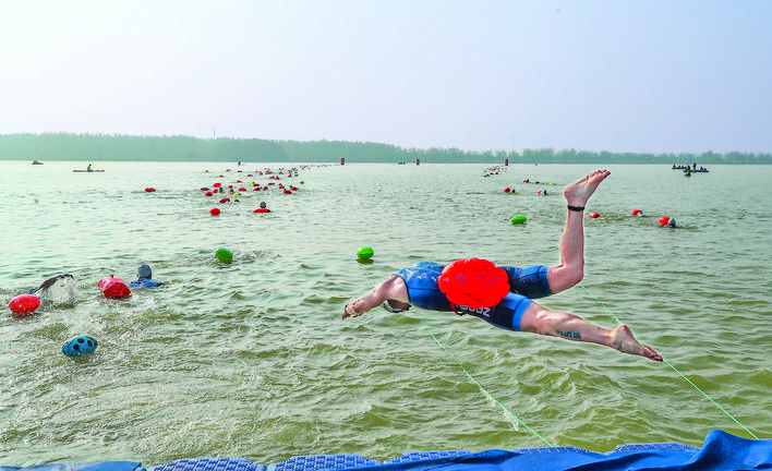 7月13日,2025年山西省“7·16全民游泳健身主题系列活动”启动仪式山西省铁人三项系列赛(运城站)暨芮城圣天湖公开水域游泳比赛在芮城县圣天湖景区举行。本次赛事共吸引来自19个省、市的近400名游泳爱好者及铁人三项运动员参加。 图为7月13日,参加比赛的选手在进行游泳项目的比赛。 本报记者 金玉敏 摄