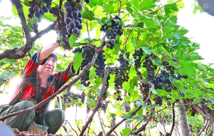 近日,新绛县龙兴镇王庄村的葡农在采摘葡萄。 近年来,新绛县持续加大政策、技术和资金等支持,葡萄种植已辐射当地5个乡镇。 特约摄影 高新生 摄