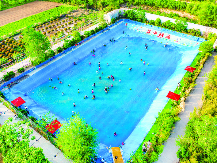 上图 盐湖区东郭镇野趣大自然亲子农场新设“瓮中抓鱼”项目,吸引了众多游客。 记者 陈方斌 摄