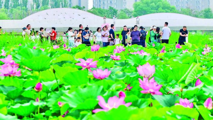 樊先生一家三口从尧梦公园北入口进入,顺着步道前行。公园内人流如织,原本宽阔的道路被来往游客挤得满满当当,竟然显得有些窄细。空气中蒸腾着草木清香、汗味与不知何处飘来的小吃香味,孩子们追逐嬉闹,老人们坐在石凳上摇着蒲扇,年轻人打着羽毛球、乒乓球、排球等,场面十分热闹。来到荷花池前,满池荷花竞相绽放,清香四溢,樊先生赶紧找好角度给家人拍了几张照片。