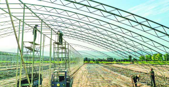 7月17日,位于夏县埝掌镇埝掌村的产业集群项目工地,工人在搭建设施大棚。 据了解,埝掌镇在埝掌村启动占地50亩的产业集群项目,全部采用标准化设计,建成后将为提升农业现代化水平增添“造血”功能。 特约摄影 张秀峰 摄