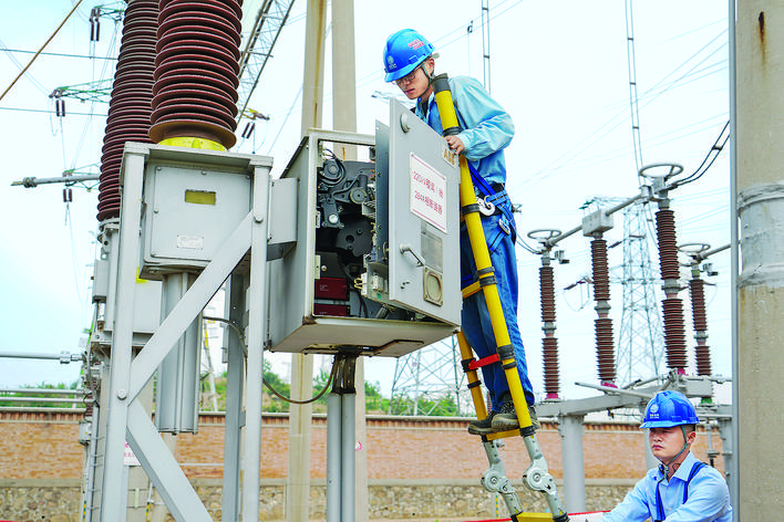 ▶国网山西省电力公司运城供电公司变电检修中心工作人员在220千伏闻喜变电站进行检查消缺。