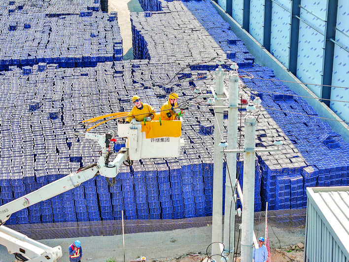 ▲国网山西省电力公司运城市盐湖区供电公司工作人员正在进行带电作业,保障群众用电。