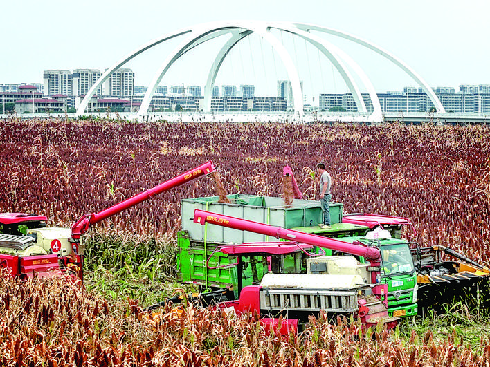 9月21日,收割机卸下收割的高粱(无人机照片)。 近日,江苏农垦江心沙农场位于常州金坛长荡湖和钱资湖畔外拓基地的8000余亩高粱陆续成熟,迎来采收季。成片的高粱映红田野,游人在安全地带打卡拍照,远处收割机来回穿梭,呈现出生动喜人的丰收图景,“农业+旅游”现代都市近郊农业公园雏形初现。 新华社发(许丛军 摄)