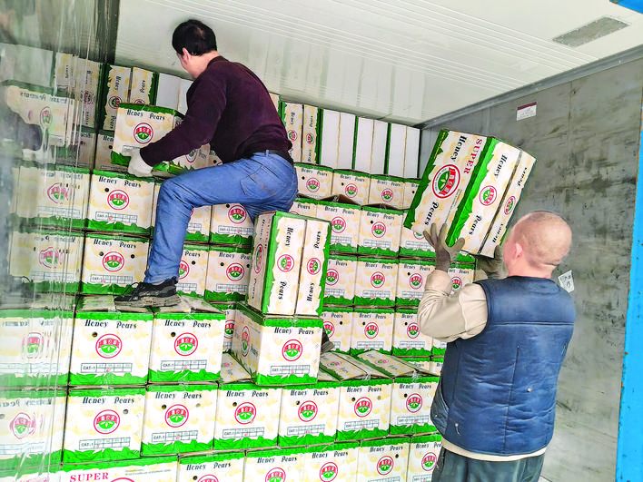 运城鑫农源家庭农场的工人在将梨果装进集装箱货车。 本报记者 范 娜 摄