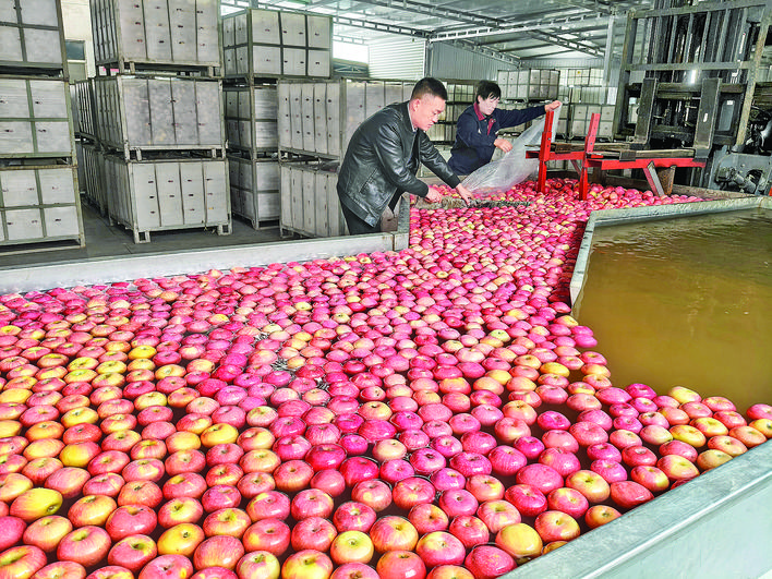 上图 在山西海河果品股份有限公司的苹果加工车间,工作人员把一箱箱苹果倒入自动清洗池。
