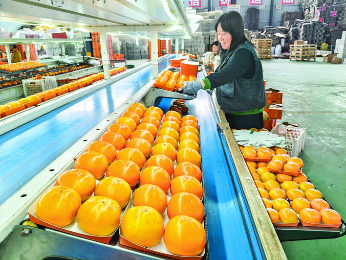 临猗县卫峰果品种植专业合作社分选设备旁,工作人员在包装甜柿。