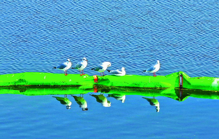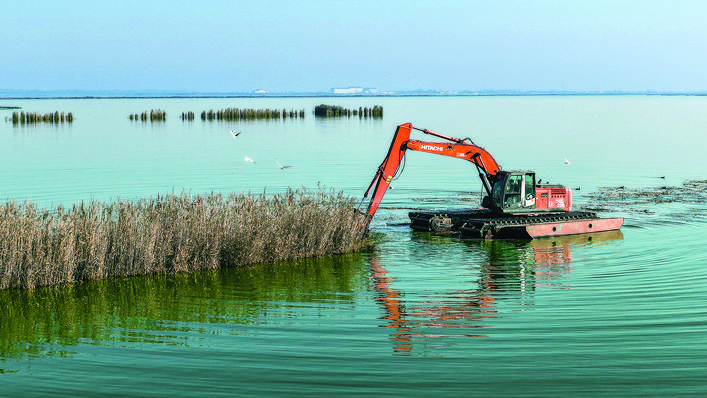 11月21日,永济市伍姓湖湿地内,一台大型挖掘机紧张有序地开展湖底淤泥与杂草清理作业。一群远道而来的海鸥环绕机械盘旋飞舞,轰鸣的机械声与清脆的鸟鸣声此起彼伏,交织成一曲美妙和谐的冬日乐章。 特约摄影 程永仁 摄