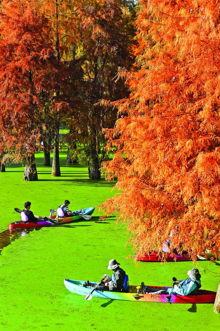 ▲11月28日,游客在青山湖“水上森林”泛舟。 随着气温降低,浙江省杭州市青山湖的近百亩池杉、落羽杉披上色彩斑斓的“衣装”,和水面碧绿的浮萍相映成景。新华社记者 翁忻旸 摄