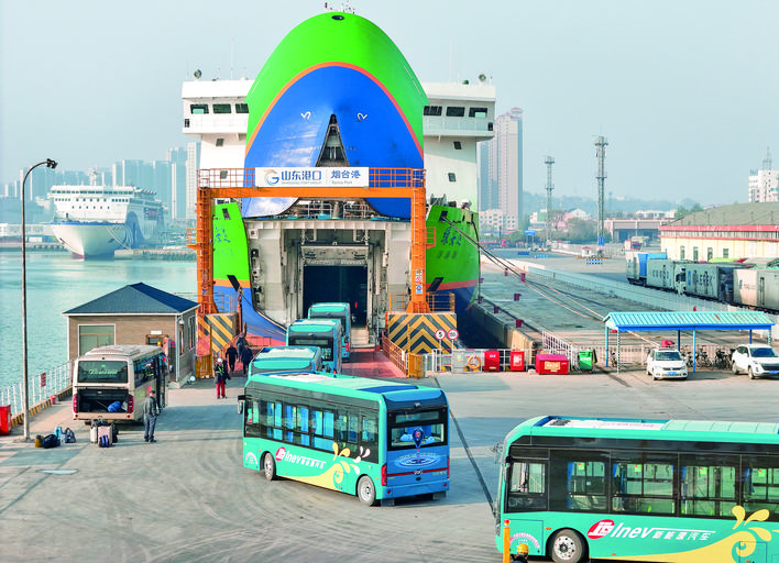 11月30日,一批全新的纯电动公交车在山东港口烟台港登上新能源汽车运输船“绿安达”轮,跨越渤海海峡前往辽宁大连,交付大连交运集团(无人机照片)。 新华社发(唐 克 摄)