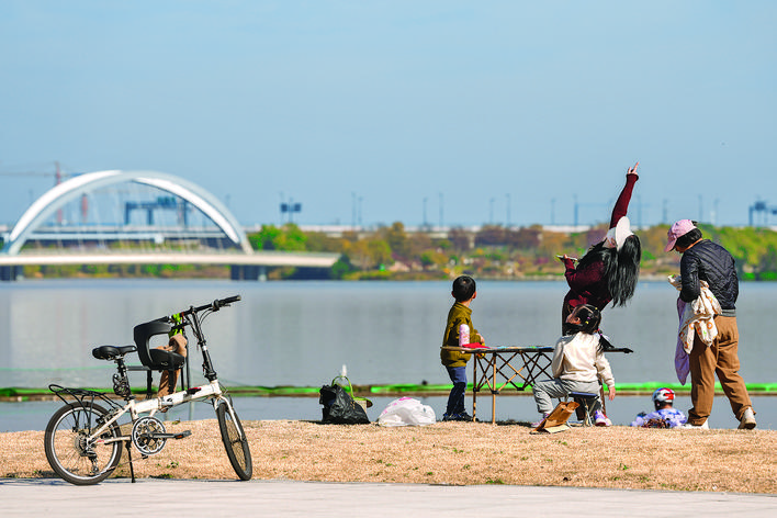 11月30日,游客在浙江绍兴迪荡湖景区休闲。 位于绍兴越城区的迪荡湖景区是一座融自然生态、休闲娱乐与现代风貌于一体的城市湖泊公园,迪荡湖素有“绍兴版西湖”之美誉。 新华社记者 黄宗治 摄