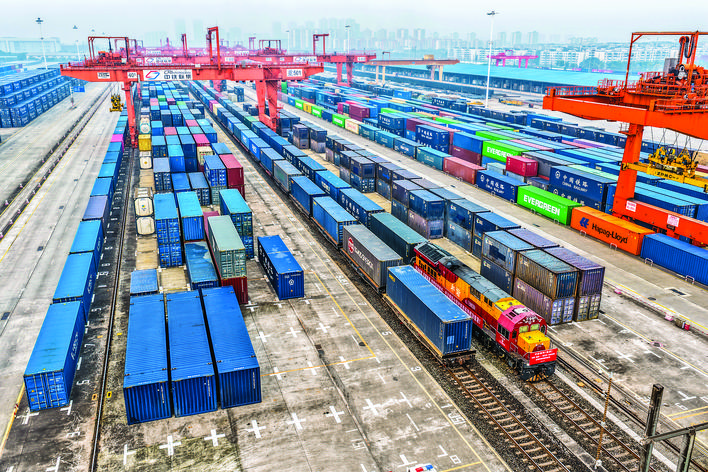 11月30日,重庆—匈牙利布达佩斯全程时刻表中欧班列在重庆团结村中心站等待发车(无人机照片)。 当日,这列满载汽摩配件、日用百货等商品的中欧班列从重庆团结村中心站开出,标志着重庆—匈牙利布达佩斯全程时刻表中欧班列正式开行。 该班列全程运行11天左右,初期计划每两周开行一列。 新华社记者 唐 奕 摄