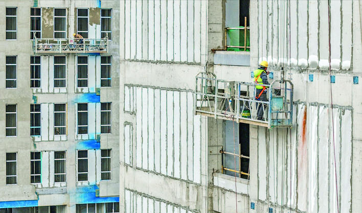▲11月27日,万荣现代农业产业示范区检验检测及公共服务平台基础设施建设项目工地上,工人在进行外立面施工。 据了解,该项目规划用地面积16254.7平方米,总投资1.04亿元。目前,两栋主楼的窗框及消防设施安装、外墙保温、室内防水等工序正有序进行,预计明年5月全面竣工并投用。本报记者 金玉敏 摄