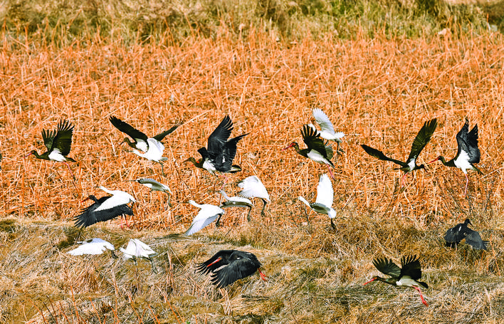 ▶12月14日,万荣县汾河湿地迎来30余只黑鹳在此集群栖息,创下当地单次观测黑鹳数量的新高。
