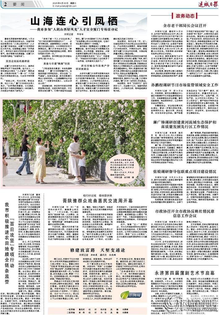 本报讯(记者 张俊瑛 通讯员 张 曼)4月29日,市人大常委会副主任廉广锋带领调研组,赴芮城县就创建黄河流域生态保护和高质量发展先行区工作进行调研。