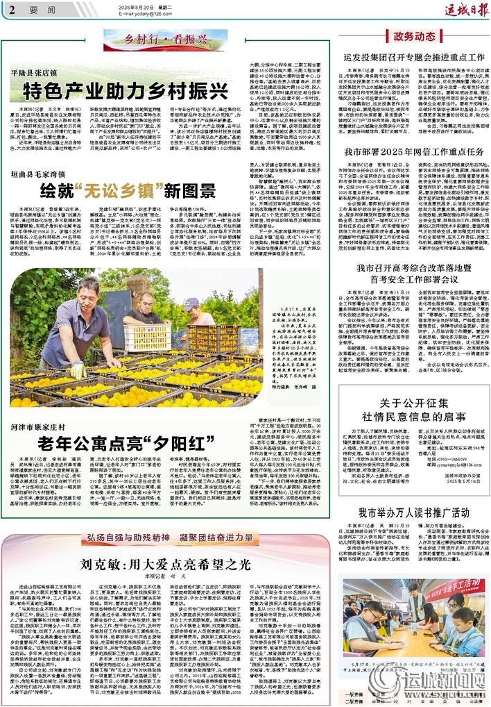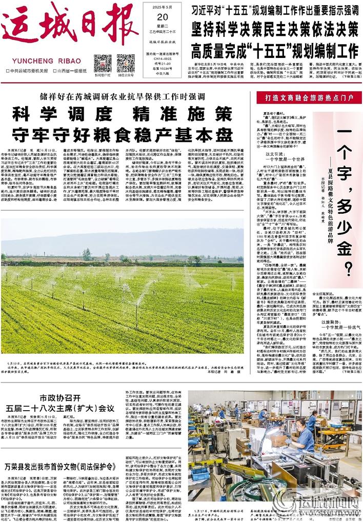 本报讯(记者 张 越)5月19日,市委书记储祥好深入芮城县调研农业抗旱保供工作。他强调,要深入学习贯彻习近平总书记关于“三农”工作的重要论述,坚决扛牢粮食安全政治责任,科学调度资源,精准靶向施策,全力以赴打好抗旱保供攻坚仗