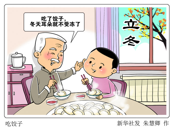 ◀立冬,是二十四节气中的第十九个节气,标志着冬季的开始。 立冬时节,各地有丰富多彩的传统习俗。北方有“立冬补冬,补嘴空”的谚语,人们习惯在立冬这天吃饺子,因为饺子外形似耳朵,人们认为吃了它,冬天耳朵就不受冻。 新华社发 朱慧卿 作