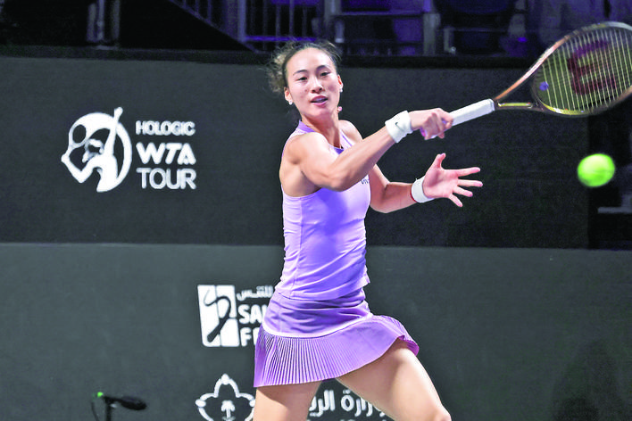 ▶11月6日,郑钦文在比赛中回球。 当日,在沙特阿拉伯利雅得进行的WTA年终总决赛小组赛中,中国选手郑钦文2比0战胜意大利选手保利尼,晋级半决赛。 新华社记者