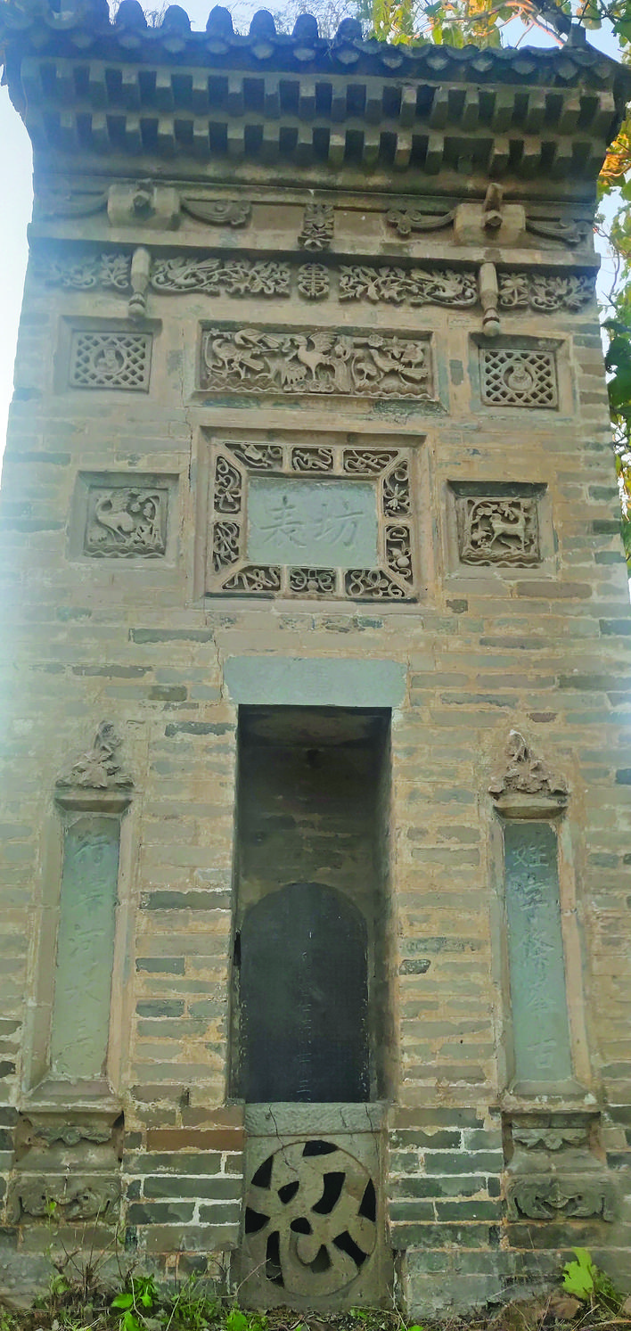 楼身正面开设方形碑龛,内嵌石碑一通,龛内上部石刻八卦图,龛下部置石雕镂空字“忍”字栏杆。碑龛两边嵌石楹联一副:“姓字条峰古;行踪河流水。”联框上部饰砖雕挂钮,下部饰莲瓣。碑龛上边石牌匾题曰“坊表”,砖匾框为镂雕暗八仙图案。牌匾两边各施一方砖雕,题材为“福禄图”。牌匾上方,垂柱之下明间作荷鹤(谐音“和合”)二仙图案,次间为砖雕透风窗。牌匾左边一方砖雕题材为“封侯挂印”,右边一方砖雕题材为“松鹤延年”。