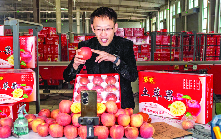 运城晚报讯(记者 陶登肖)“直播间的家人们,大家现在看到的苹果来自运城万荣。你们看这个果面红润、果肉脆爽多汁、口感紧实,有需要的家人们点击下方小黄车,直接购买。”在运城市杨爱笑电子商务有限公司的仓库一角,主播正在热情洋溢地讲解着手中的农产品。