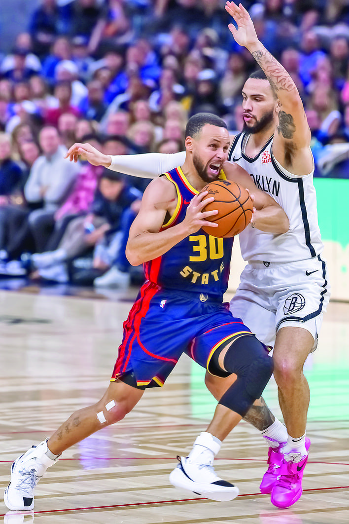 ▲11月25日,勇士队球员库里(左)在比赛中进攻。当日,在2024-2025赛季NBA常规赛中,金州勇士队主场120比128不敌布鲁克林篮网队。新华社发(董旭东 摄)