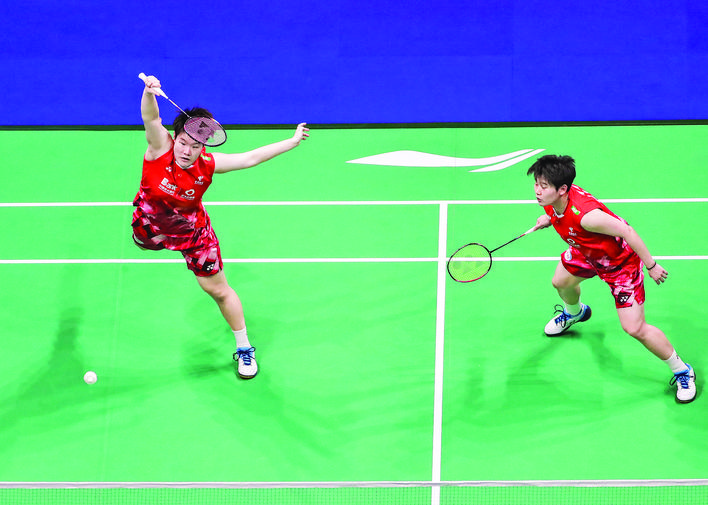▶11月24日,刘圣书/谭宁(右)在比赛中。 当日,在广东深圳举行的2024中国羽毛球大师赛女子双打决赛中,中国组合刘圣书/谭宁2比0战胜中国组合李怡婧/罗徐敏,夺得冠军。 新华社发