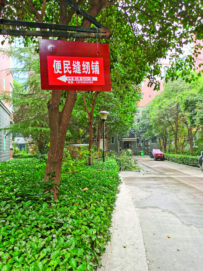沿着小区的道路行走,在6号楼的路边竖着一个“便民缝纫铺”的标志牌,牌子上标注着缝纫铺的门牌号、联系电话等信息。