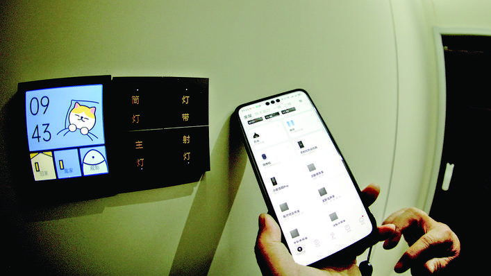 墙上的开关也有一番妙用。“你别看这个开关上写着控制的是筒灯、主灯、走廊灯等,但若是想要控制卧室灯或者窗帘,我通过设置就能随意调换,非常方便”。