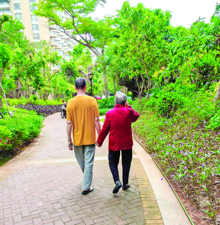 手牵手,一起走,老来伴,不分手。相依相偎暖心头,不给儿女添忧愁。