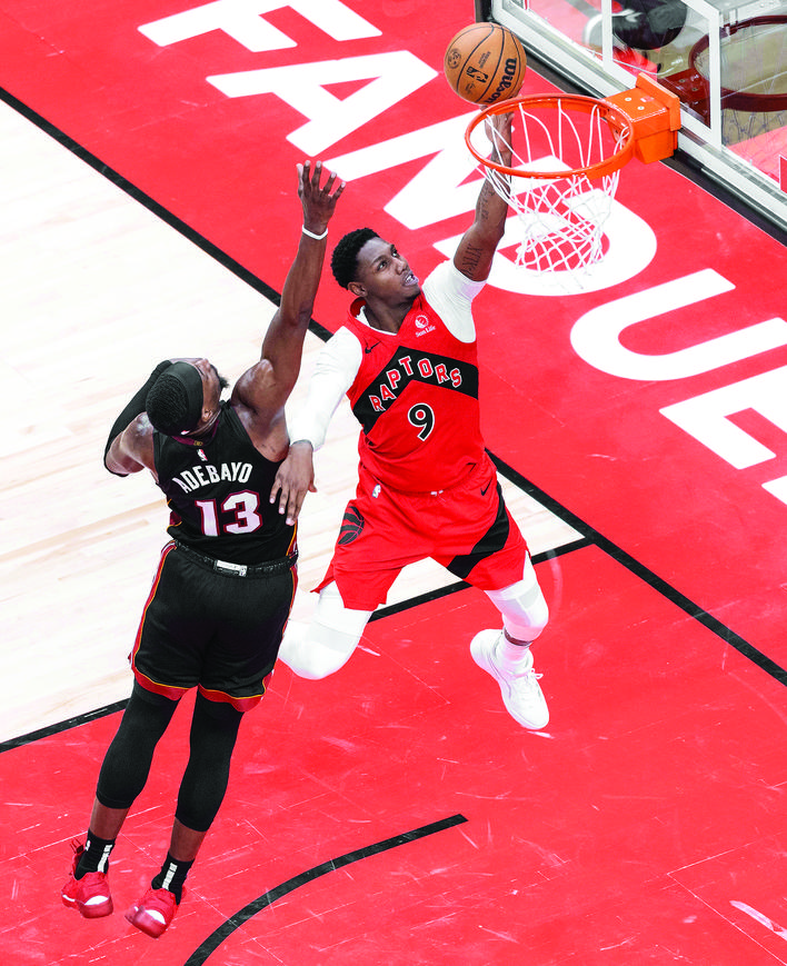 ▲12月1日,猛龙队球员巴雷特(右)在比赛中上篮。 当日,在2024-2025赛季NBA常规赛中,多伦多猛龙队主场119比116战胜迈阿密热火队。 新华社发(邹峥 摄)