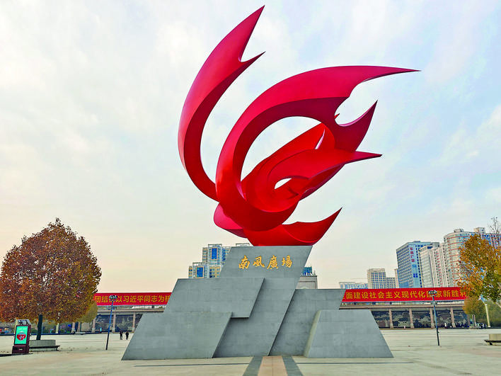 广场上的凤凰雕塑,也换上了崭新的“红装”。远远望去,它就像一只展翅欲飞的火凤凰,矗立于广场中央,格外耀眼吸睛。走近细看,更是被其鲜红的颜色和宏伟的气势所震撼。