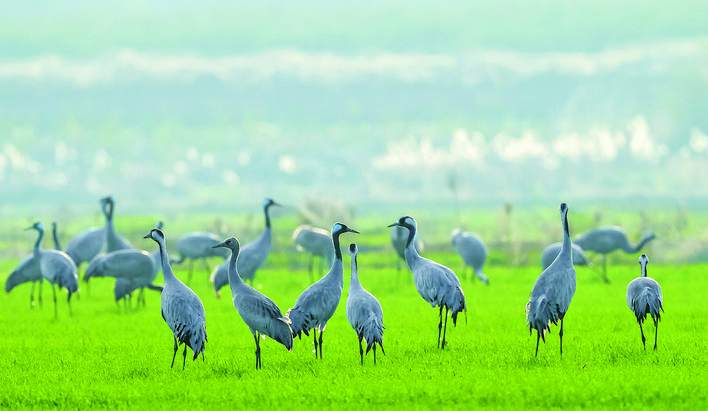 ▲近日,一群灰鹤在盐湖区解州镇的连片麦田里觅食、栖息。据悉,灰鹤是国家二级保护野生动物。 高志勇 摄