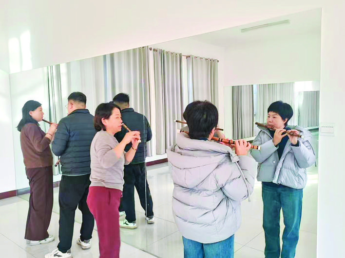 在练习环节,学员们热情高涨,纷纷拿起笛子尝试吹奏(右图)。从一开始的气息不稳、指法生疏,到逐渐能够吹出简单的音阶和旋律,每一次进步都让他们欣喜不已。在老师的耐心指导下,学员们很快就能较为熟练地吹奏一些简单的曲目,清脆悦耳的笛声在活动中心回荡。