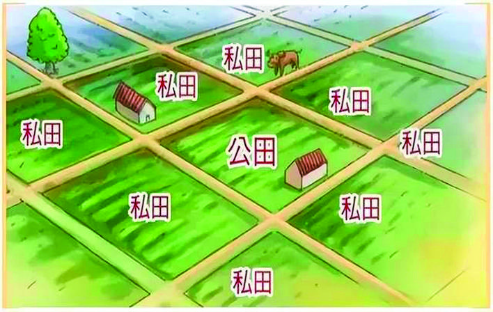 井代表井田制。熟悉先秦历史的朋友都知道,井田制是商周时期的一种土地制度。道路和渠道纵横交错,把土地分隔成方块,形状像井字,因此称作井田。《谷梁传》里讲:“古者三百步为里,名曰井田。”到了商鞅变法“废井田,开阡陌”,井田制虽然存在的时间并不长,却已经刻在古人记忆里,某种程度上它就代表了家乡。
