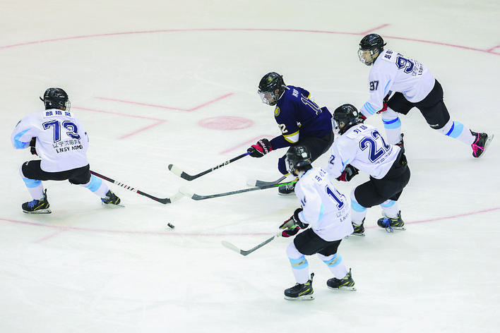 ▼12月8日,北京京狮男子冰球队球员蒋思雄(中)在比赛中突破。