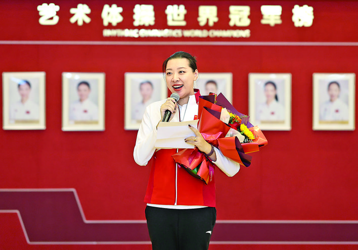 ▲中国艺术体操队教练孙丹在登榜仪式上发言