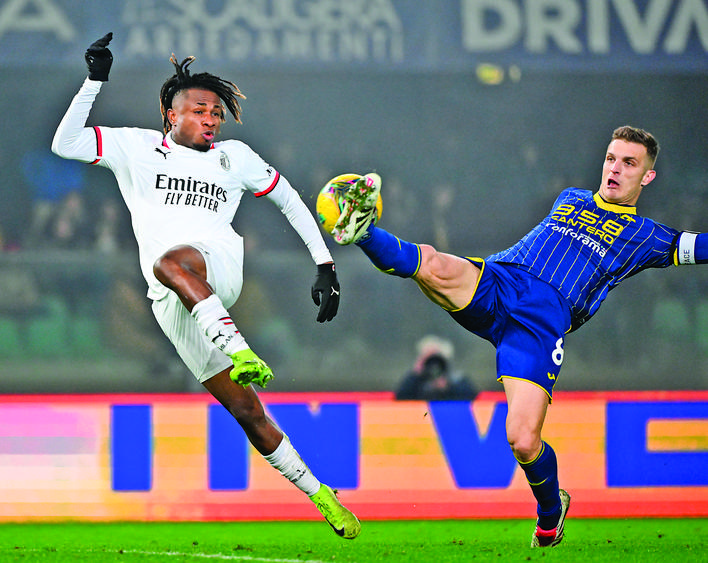 ▶12月20日,AC米兰队球员楚克乌泽(左)与维罗纳队球员拉佐维奇在比赛中拼抢。 当日,在2024~2025赛季意大利足球甲级联赛第17轮比赛中,AC米兰队客场1比0战胜维罗纳队。 新华社发(阿尔贝托·林格利亚 摄)