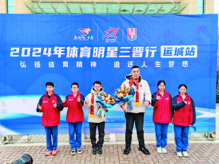 运城晚报讯(记者 杜磊 陈怡霏)12月25日,2024年“体育明星三晋行”活动(运城站)在夏县实验中学举行(右图)。全运会摔跤冠军梁磊和世界武术锦标赛冠军崔碧晖走进校园,为在场的700余名师生传授体育技能、分享奋斗故事,充分彰显了榜样的力量。