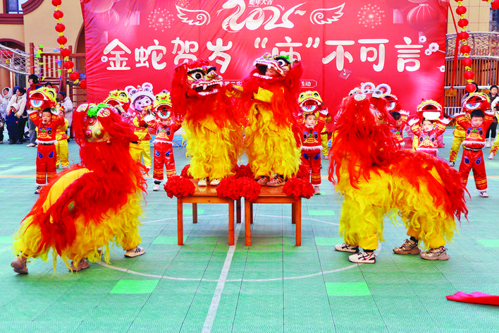 锣鼓声声、雄狮舞动,活动就此拉开序幕。在老师的指导下,孩子们折纸剪窗花,纸屑纷飞间,活灵活现的生肖蛇与福字诞生;小手专注编织中国结,系紧对新年的美好祈愿。