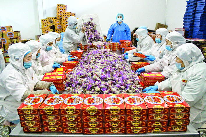 ▲1月9日,在闻喜县任诚意煮饼食品开发有限公司的车间里,员工们正在包装煮饼。