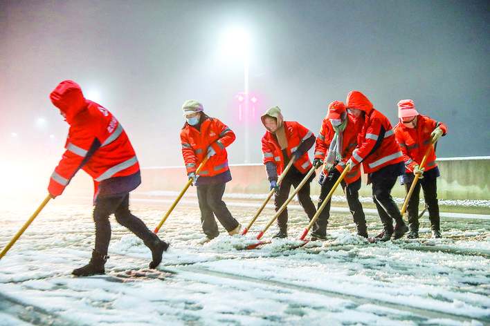 ▲1月9日,环卫工人在贵州省贵阳市开阳县硒州大道清理路面积雪。 受新一轮冷空气影响,贵州省内大部分地区迎来降雪、降温天气,贵州省启动低温雨雪凝冻灾害IV级应急响应。新华社发