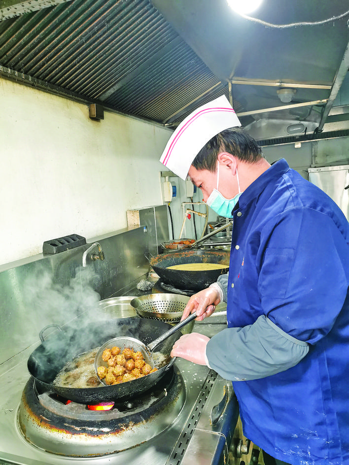 走进年货加工厨房,映入眼帘的是一派繁忙景象:蒸箱冒着蒸汽,工人师傅将一屉屉盛放着食材的扣碗推入蒸箱;灶台上,火苗炙烤着锅底,锅里的油冒着热气,厨师将调制好的肉馅用手指一撮,一个个小肉团顺着锅沿滑进油里,随着“嗞啦嗞啦”的声响,肉团在油里上下翻滚,一会工夫,金黄色的肉丸子浮上来,浓郁的香味扑面而来。
