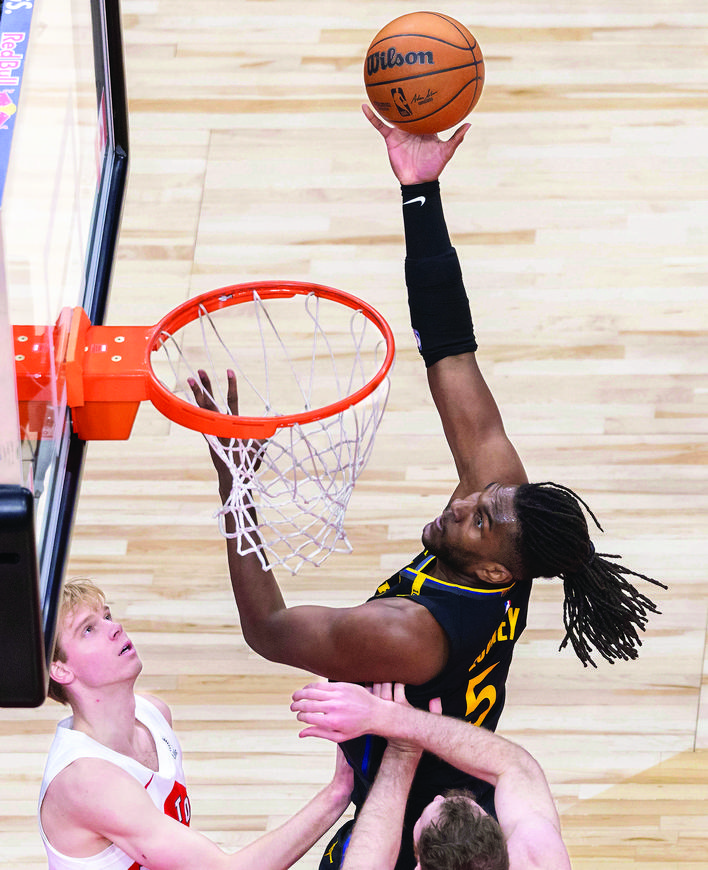 ◀1月13日,勇士队球员卢尼(右)在比赛中上篮。 当日,在2024-2025赛季NBA常规赛中,多伦多猛龙队主场104比101战胜金州勇士队。 新华社发