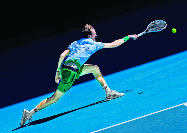 ◀1月14日,梅德韦杰夫在比赛中回球。当日,在墨尔本进行的2025年澳大利亚网球公开赛男单首轮比赛中,俄罗斯选手梅德韦杰夫3比2胜泰国选手甲西迪·讪雷,晋级下一轮。新华社发