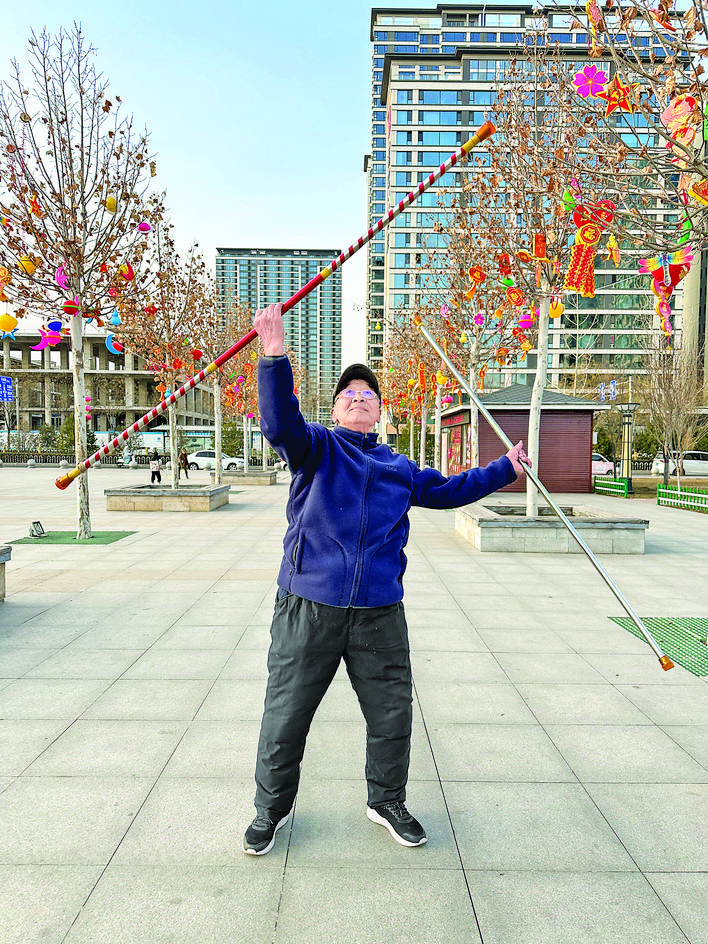 李大爷玩棍有些年头了,玩的棍法五花八门。他打趣说:“这玩棍,可比孙悟空的金箍棒玩法还多!”他的学习途径也很广,自学钻研是一方面,看到别人玩出新颖招式,也会虚心求教,立马学起来。