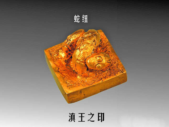 云南晋宁石寨山出土的“滇王之印”,现藏中国国家博物馆。汉代封赐南方蛮夷君长,多以蛇纽印。