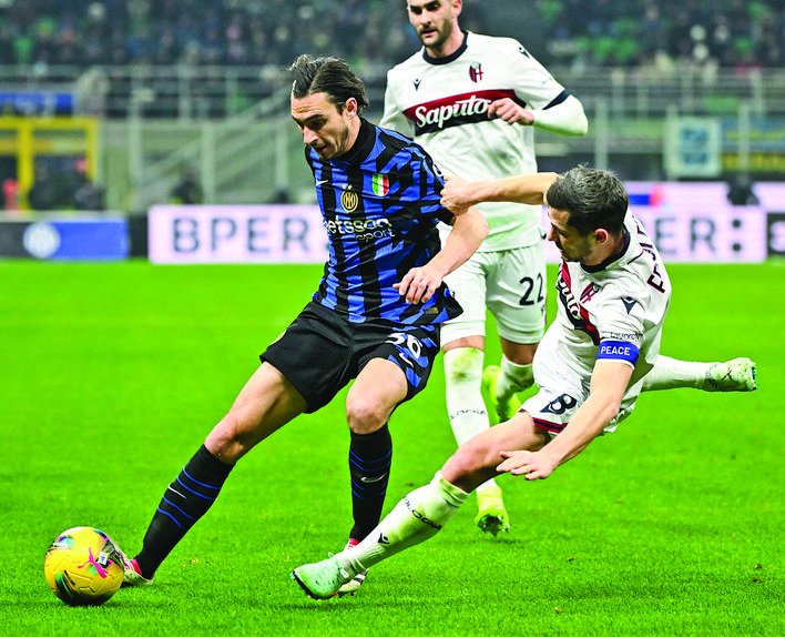 ▶1月15日,国际米兰队球员达米安(左)与博洛尼亚队球员弗罗伊勒在比赛中拼抢。当日,在2024-2025赛季意大利足球甲级联赛第19轮比赛中,国际米兰队主场2比2战平博洛尼亚队。新华社发