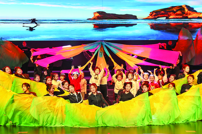 在现场编导的指挥之下,身姿轻巧的女演员们手持绿色扇子,上下舞动间,宛如青山层层叠叠,又似绿色精灵轻盈跳跃;后方的男演员们向上抛出彩色绸缎,为整个节目增添了一抹新春的热闹与喜庆;小朋友们穿梭其中,挥舞双臂,洋溢着蓬勃向上的生命力。