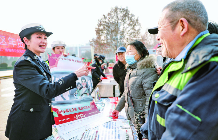 “大爷,您都买了些啥东西啊?我这有份年货,您瞧瞧。”现场,李泽颖等民辅警笑着将交通安全宣传手册递到大爷手中,“驾驶电动自行车要佩戴头盔、严禁载人,还得遵守交通规则,这样才能安全到家、平安过年……”大爷听得认真、民辅警讲得仔细,安全意识在这一来一往的交谈间悄然深入人心,“我们交警在前面支了个摊,有表演,还送‘福’字,您要是有时间,过去转转。”