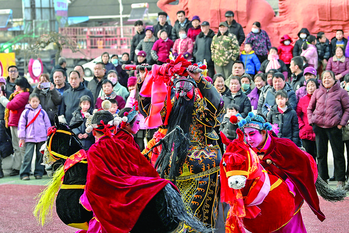 ▲2月9日,陇县曹家湾镇流渠村社火队在陇县曹家湾镇三里营村进行游演。 陕西省宝鸡市陇县古称陇州,是“中国社火文化之乡”。陇州社火历史悠久、特点鲜明,被列为陕西省第一批非物质文化遗产。陇县曹家湾镇流渠村有一支年轻的社火队,队员里最大的18岁,最小的12岁,许多孩子是第一次表演社火,却表演得活灵活现,受到村民热烈欢迎,成为黄土地上的一道亮丽风景。 “孩子们放寒假回到村里,跟着村里的社火老艺人学习人物典故、表演动作,一个个都可认真了!”流渠村村支书袁兴利说,希望通过这种方式,让这门古老的民间艺术代代相传。
